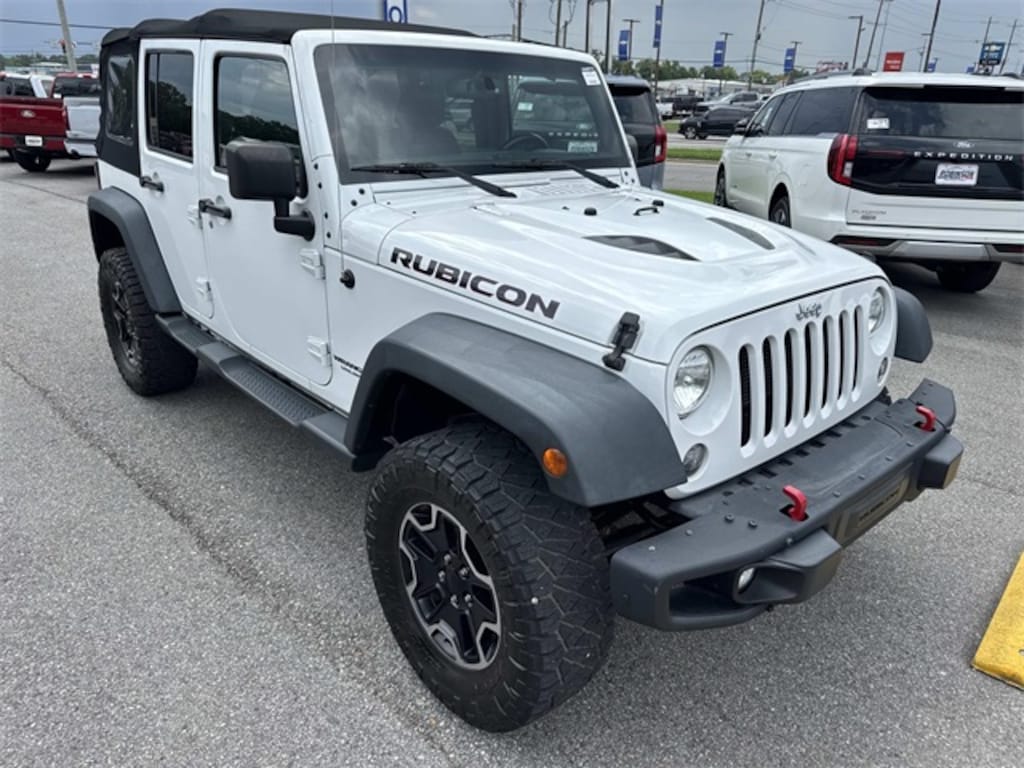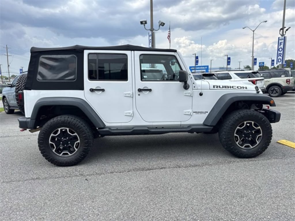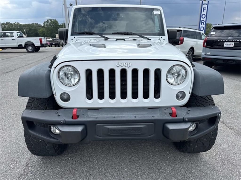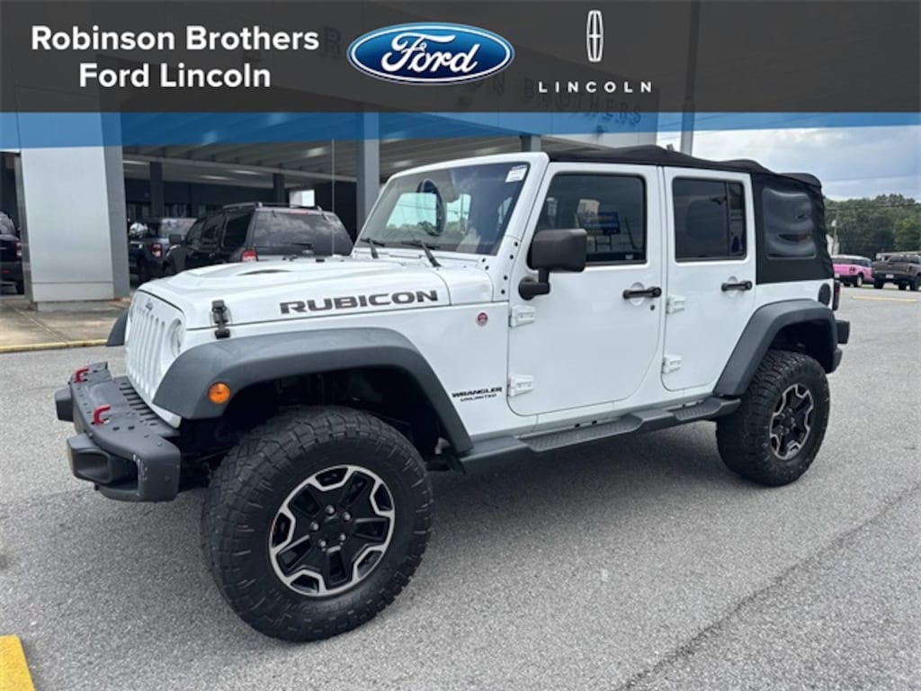 Robinson Brothers Ford Lincoln specializes in one owner lease returns and trade in vehicles - not cars from rental companies! We believe it is a much better value for your money to purchase a one owner lease return or a customer trade-in as opposed to rental units that have not been taken care of! We offer a complimentary vehicle history report on all of our vehicles! Buy with confidence! Connectivity Group (Tire Pressure Monitoring Display and Vehicle Information Center), Max Tow Package (Class II Receiver Hitch and Trailer Tow w/4-Pin Connector Wiring), Quick Order Package 24J Rubicon Hard Rock (Accent Stitching, Alpine 9-Speaker w/All Weather Subwoofer, Black/Chrome Screws Fuel Filler Door, Chrome/Leather Wrapped Shift Knob, Driver Height Adjuster Seat, Front Seat Back Map Pockets, Heated Front Seats, Hood w/Power Dome, Leather Trimmed Bucket Seats, Low Gloss Black Wrangler Decal, MOPAR Dealer Installed Tow Strap Kit, MOPAR Slush Mats, Premium Black Sunrider Soft Top, Premium EVIC Message Center, Red Front & Rear Tow Hooks, Red Trail Rated Badge, Rubicon Hood Decal, Silver Interior Accents, Steel Front Bumper, Steel Rear Bumper, Sunrider Soft Top, and Wheels: 17" x 7.5" Polished Semi-Gloss Black), Rubicon Hard Rock Package, GPS Navigation, 17" x 7.5" Polished Mineral Gray Wheels, 4-Wheel Disc Brakes, 4.10 Rear Axle Ratio, 40GB Hard Drive w/28GB Available, 5-Year SIRIUSXM Travel Link Service, 6.5" Touch Screen Display, 8 Speakers, ABS brakes, Add 4.10 Axle Ratio, Air Conditioning, Alloy wheels, AM/FM radio, Audio Jack Input for Mobile Devices, Auto-dimming Rear-View mirror, Brake assist, CD player, Cloth Bucket Seats, Compass, Driver door bin, Driver vanity mirror, Dual front impact airbags, Electronic Stability Control, Front anti-roll bar, Front Bucket Seats, Front Center Armrest w/Storage, Front fog lights, Front reading lights, Fully automatic headlights, Heated door mirrors, Illuminated entry, Integrated roll-over protection, Leather steering wheel, Leather Wrapped Steering Wheel, Low tire pressure warning, Manufacturer's Statement of Origin, Occupant sensing airbag, Outside temperature display, Panic alarm, Passenger door bin, Passenger vanity mirror, Performance Suspension, Power door mirrors, Power steering, Power windows, Radio data system, Radio: Uconnect 130 AM/FM/CD/MP3, Radio: Uconnect 430N CD/DVD/MP3/HDD/NAV, Rear anti-roll bar, Remote keyless entry, Remote Start System, Remote USB Port, Security system, SIRIUSXM Travel Link, Speed control, Split folding rear seat, Steering wheel mounted audio controls, Tachometer, Tilt steering wheel, Traction control, Trip computer, and Variably intermittent wipers.